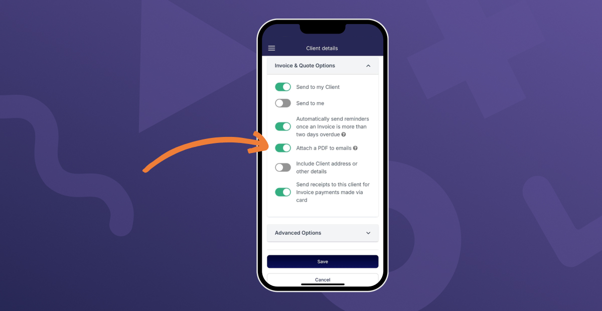 Once you’re on the “Clients” page, click on the relevant client. In the “Invoice & Quote Options” drop down menu, there’s an option to “Attach a PDF to emails”. Toggle this switch on.