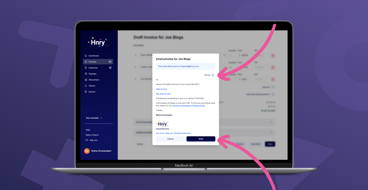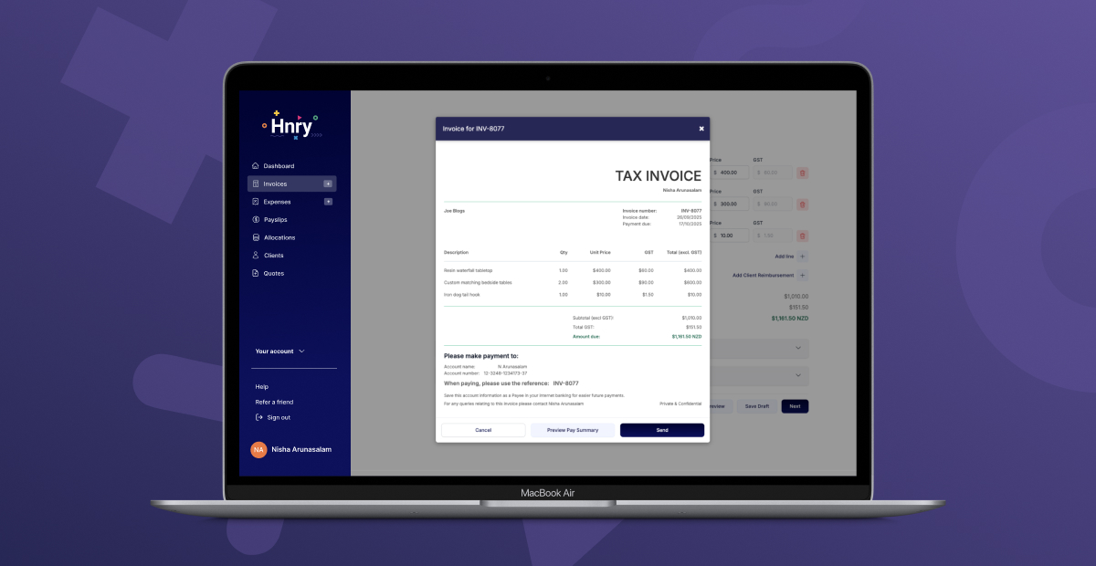 What clients look for is a clean, detailed, professional-looking invoice that gives them all the information they need for their records and GST returns. Hnry’s Invoices feature gives you just that – a clear, straightforward invoice, without any fuss.