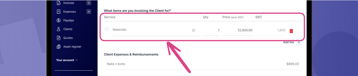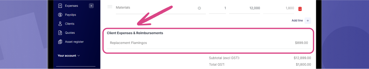 Alternatively, if you’ve purchased materials specifically for this job, you can raise these costs as Client Reimbursements in your invoice. You’ll need to create it as an expense first, and include a receipt as proof of purchase.
