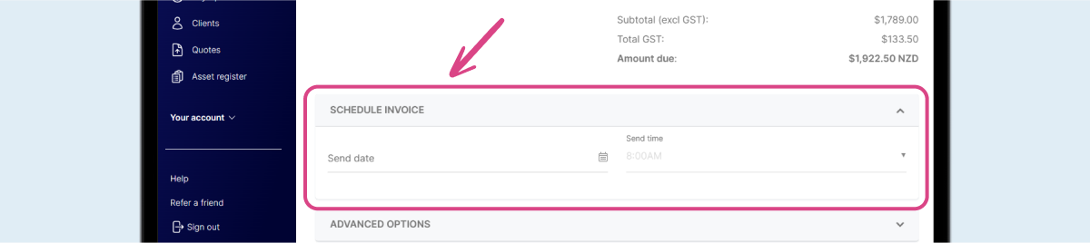 If you’re in the habit of doing your paperwork during random hours of the night (we’ve all been there), or want to create an invoice without sending it straight away, you can schedule your invoice to send at a more convenient time of day.