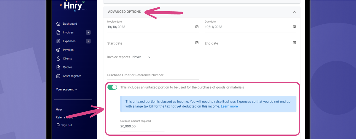 If you need funds upfront in order to purchase materials, as a Hnry customer, you can include this in your Invoice as an untaxed deposit.