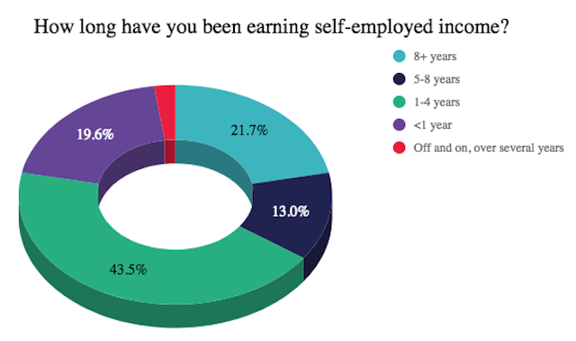 The majority (roughly 44%) of self-employed people we asked have been earning self-employed income for between one and four years. Moreover, we found that there was a fairly even split between people who had earned self-employed income for longer than eight years and those that have been earning for less than one. It’s safe to say that self-employment affects a great number of people, all of whom find themselves in various socioeconomic groups.