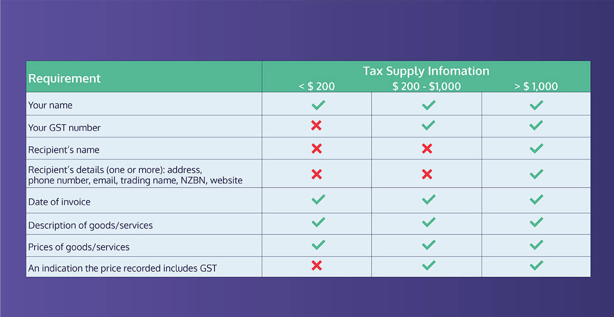 And if you and your client are GST registered, you’ll also need to make sure your invoices are compliant with the IRD’s taxable supply information rules. If you don’t, your clients may struggle to claim back GST on your goods and services.