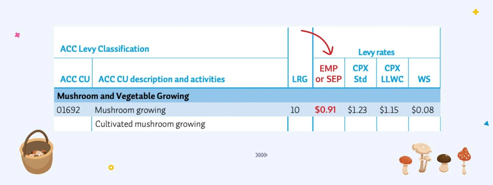 Once you’ve found the right CU, you’ll need to look up the corresponding levy rate in ACC’s levy guidebook. The basic levy rate will be listed in the “EMP or SEP” column.